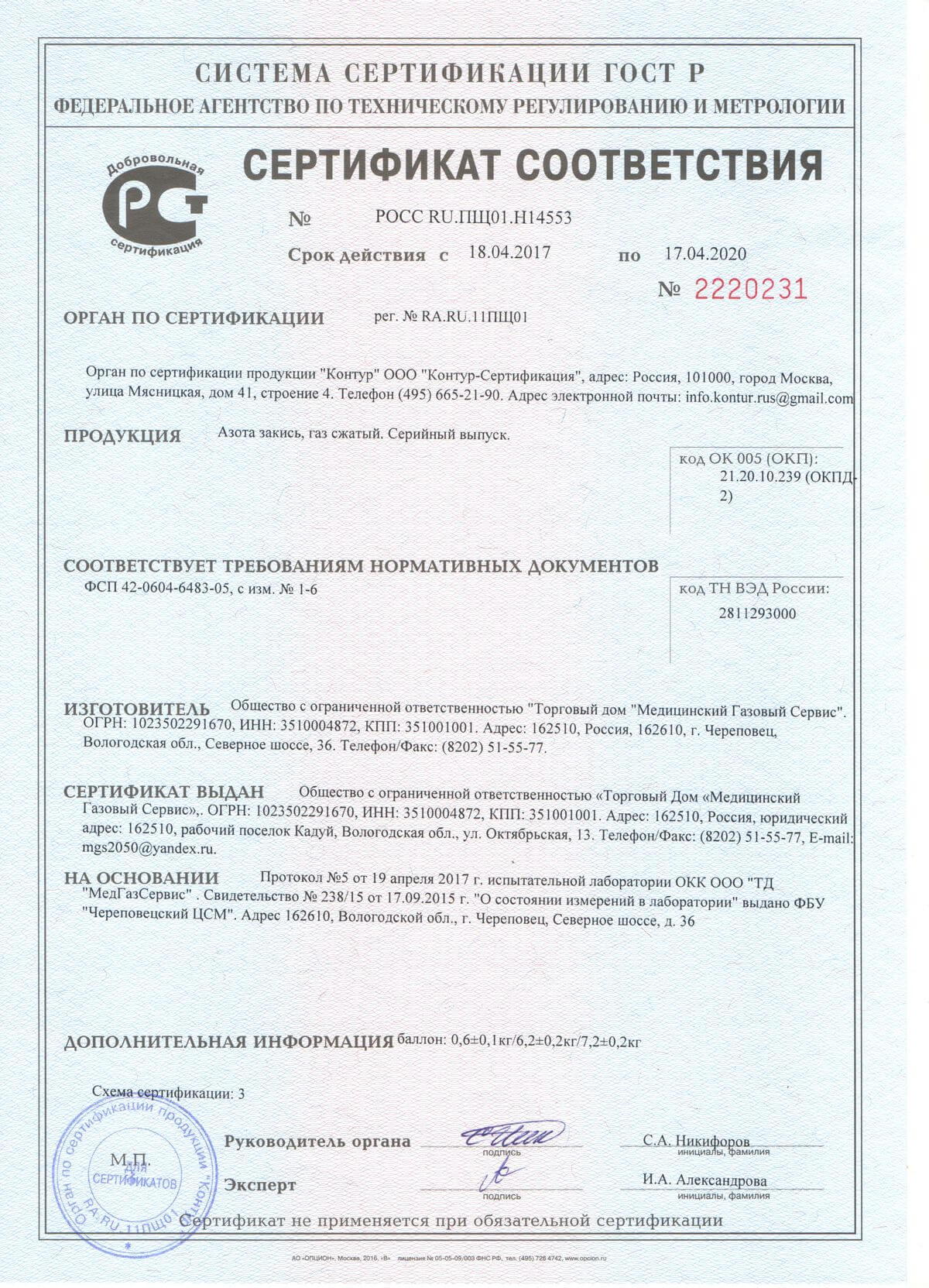 Подтверждением сертификации закиси азота служат документы, выданные Федеральным агентством по техническому регулированию и метрологии. Они имеет утвержденный формат, заверяются подписями и печатями должностных лиц. Оригинал сертификата обычно хранится в компании, которая распространяет N2O, а клиентам по их требованию предоставляются копии.